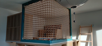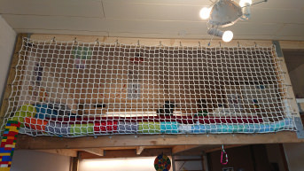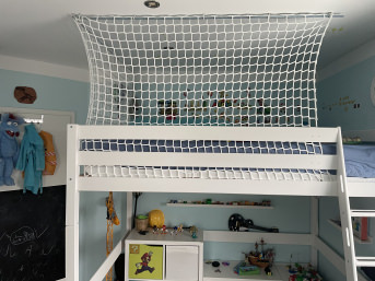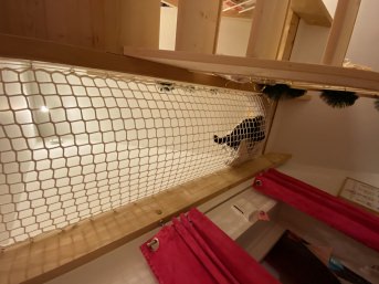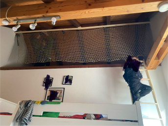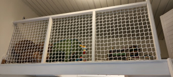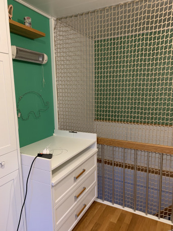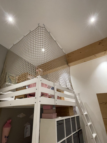 In den Zimmer von unseren Kindern haben wir die zusätzliche Ebene sowie den Treppenaufgang mit diesen Netzen "verkleidet". Damit diese Flächen zum Herabfallen abgesichert sind. Die Netze erfüllen total ihren Einsatz. Die bestellten Maße wurden auch so geliefert. Zur Anbringung haben wir uns für die Edelstahlbügel entschieden. Lieferzeit war auch sehr zeitnah. Hat alles super geklappt und auch gepasst. Hier auf den Bildern wird die Ebene momentan noch als "Stauraum" verwendet, später jedoch als zusätzlicher Bereich im Raum.
