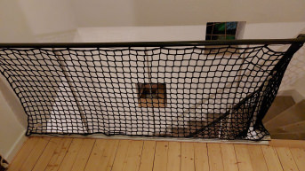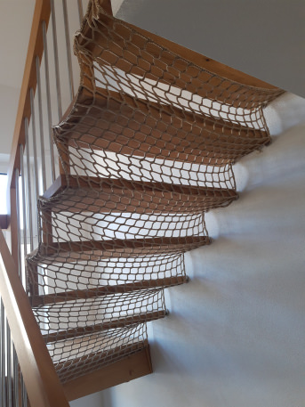 Das Netz wird als Kindersicherung an der Treppe im Obergeschoss eingesetzt. Der ursprüngliche Stahldraht hat einen zu weiten Abstand, ein Kind kann darunter durchschlüpfen.