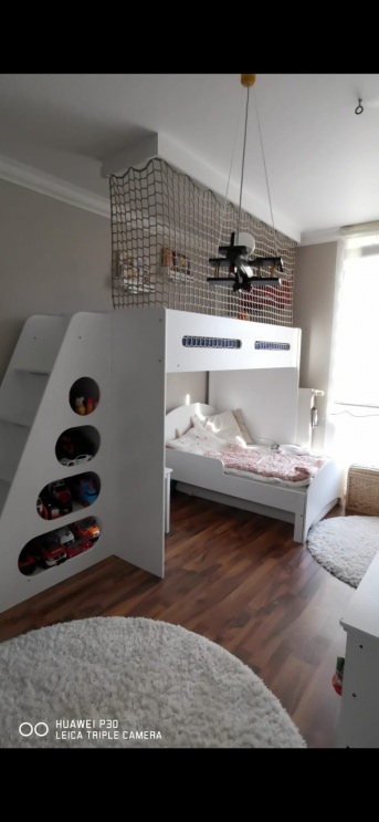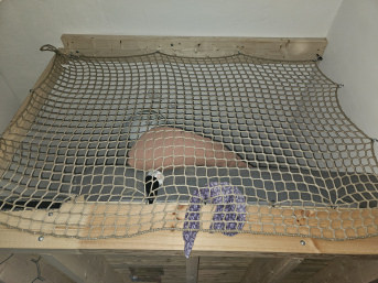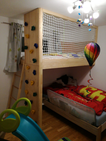 Hatte beim Bau des Hochbetts meines Sohnes an der Stelle erst nichts geplant und dann kam mir die Idee dort ein Netz zu montieren, jetzt ist das sein Lieblings Platz zum Ausruhen und seine Freunde lieben es im Netz zu liegen.