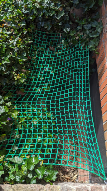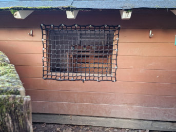 Die Befestigung haben wir mit der auch von Schutznetze24 angebotenen Befestigungsleine, Haken zur Befestigung unten und Karabinerhaken für die "Tür" verwendet.