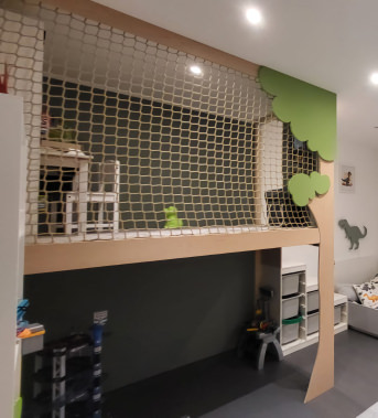 Hochbetten und erhöhte Ebenen verbinden das Angenehme mit dem Nützlichen und bieten Kindern mit Klettersprossen und Seilen viel Spielspaß im eigenen Kinderzimmer. Mit dem Schutznetz können Sie das Hochbett entweder rundum einfassen, oder es als Fallschutz neben der Schlaffläche aufspannen. So sorgt das Schutznetz für einen ruhigen Schlaf – insbesondere der Eltern.