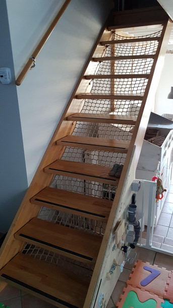 Wir haben das Netz zur Absicherung der Treppennische individuell anfertigen lassen, damit die Kinder nicht in den Keller fallen können.