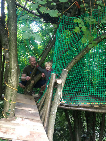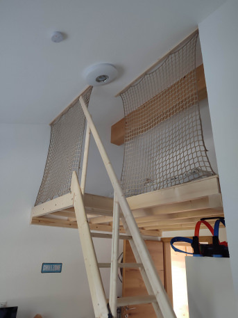 Wir haben das Netz an der Brücke vom Kletterhaus angebracht, damit unser Sohn (zweieinhalb) und seine Freunde nicht runter fallen.