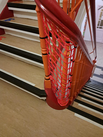 Das Sicherungsnetz ist zur Absicherung des Treppenabgangs im Obergeschoß bestimmt. Die originalen Seile des Geländers sind zu weit auseinander, so dass ein Kleinkind dazwischen durchschlüpfen kann.