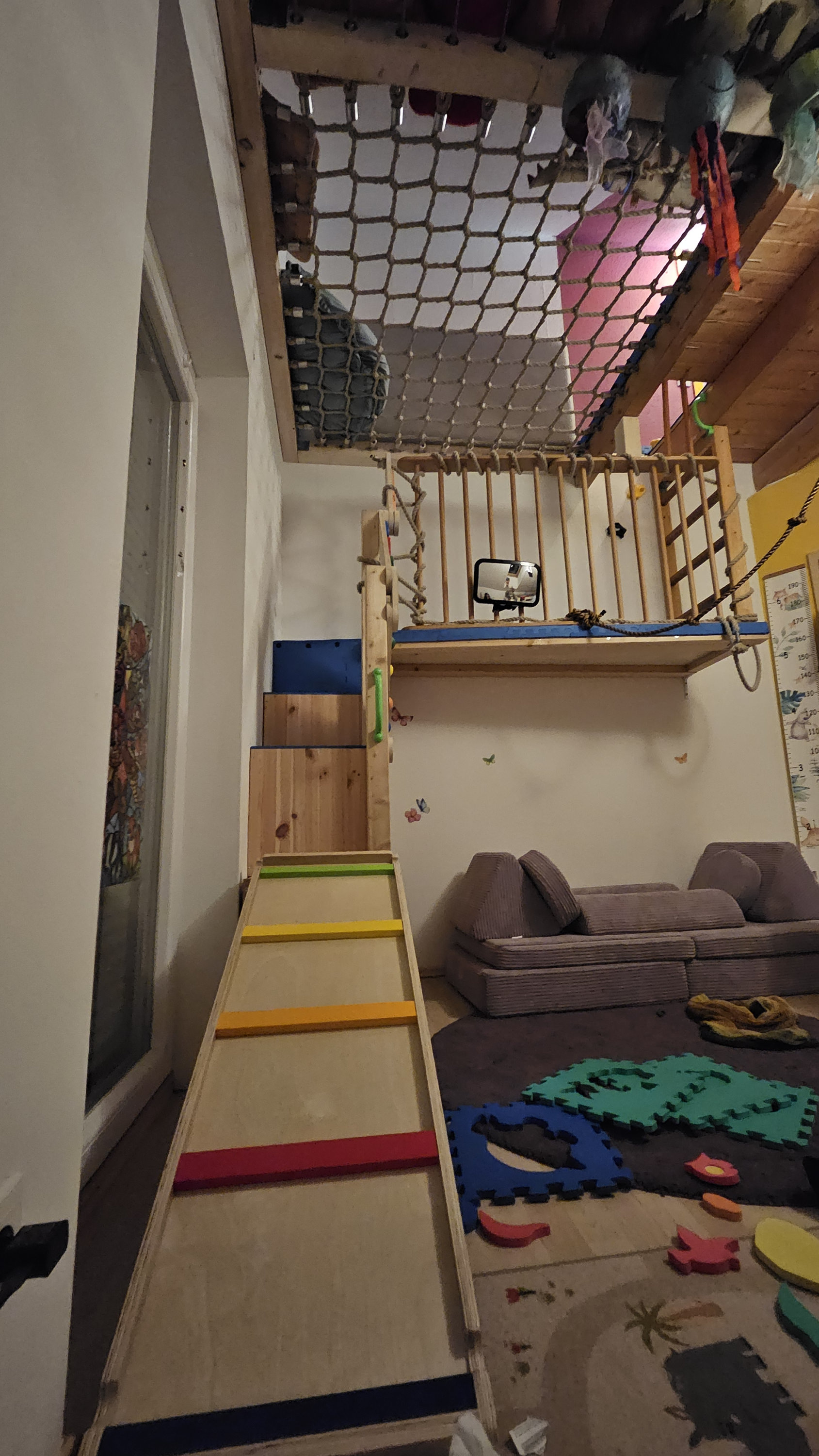 Das Kletternetz wurde im Kinderzimmer verbaut und dient als zusätzliche Spielfläche, sowie XXL Hängematte zum ausruhen.