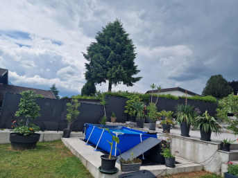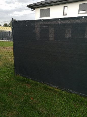 Die Plane dient als Sichtschutz zum Nachbargrundstück, lässt aber bei den 90% Blickdichte noch ausreichend Licht durch.