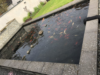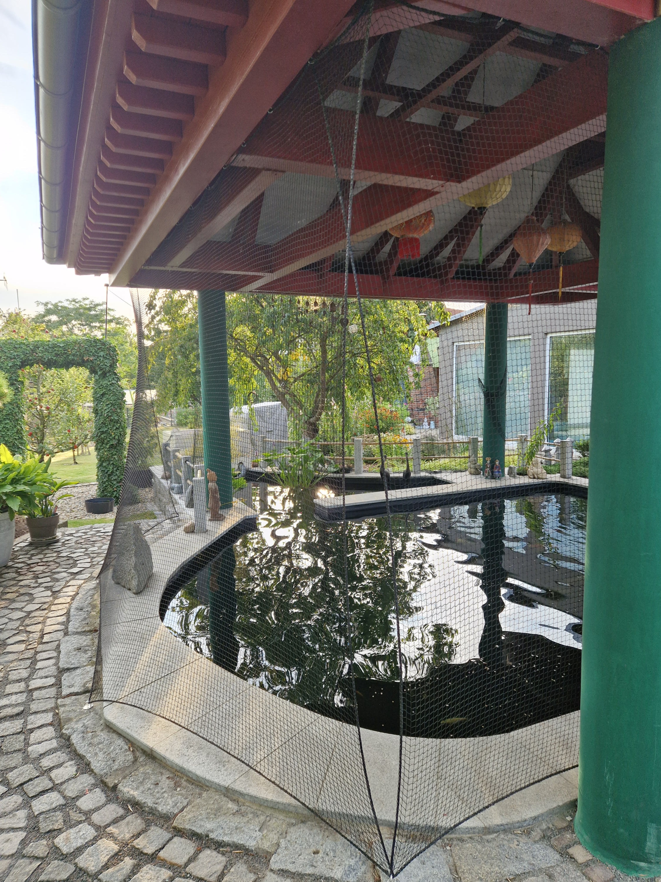 Das Netz wird zur Überdeckung des Teichs verwendet. Lösung für herabfallende Blätter und Äste und als Schutz vor dem Reiher.