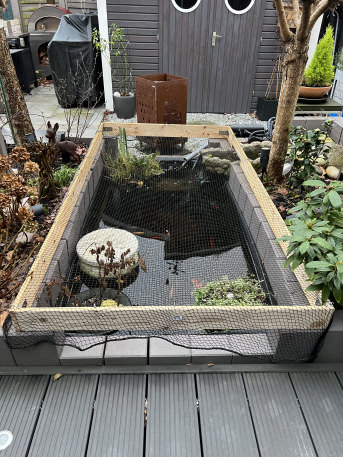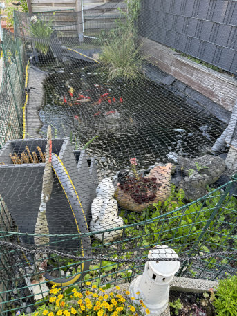 Nach so vielen Jahren haben wir endlich die ultimative Lösung gefunden um unsere Koi’s und Fische vor dem Reiher zu schützen. Somit können wir es wieder entfernen wenn die Bäume genug Blätter für den Sichtschutz haben.