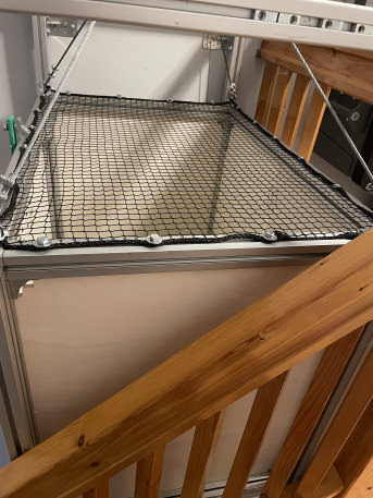 Wir haben uns überlegt, wie wir unseren kleinen Hund zeitweise abhalten können, die Treppen in unserem Einfamilienhaus uns hinterher ständig hoch und runter zu hoppeln, da sich das negativ auf seinen Körper auswirkt. Da kam uns ein gespanntes Netz in den Sinn, da einfach ein- und auszuhängen. Die massangefertigten Netze sind sehr stabil und erfüllen diesen Zweck optimal.