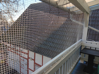 Ich habe dieses Netz anfertigen lassen, um unsere Babykatze daran zu hindern, auf die Terrasse zu gehen. Sie legt sich manchmal davor und kann das Geschehen beobachten. Die beiden Großen können herüber springen. Das Netz erfüllt komplett den gewünschten Zweck. Wir haben es mit Haken befestigt, um es einfach an einer Seite zu lösen, wenn wir durch wollen.