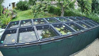 Schutznetz für Vögel und große Libellen über einer Medaka-Zuchtanlage. Die Maschenweite könnte etwas enger sein, aber dann gibt es dieses Netz nicht mehr mit der Umrandung. Egal, geht auch so, bis jetzt waren keine Libellen, oder besser gesagt deren Eier und Larven in den Zuchtbottichen, die ja meine teuren japanischen Reisfische liebend gerne fressen.