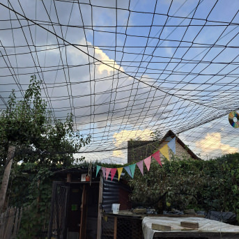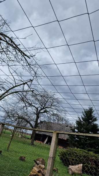 Wir schützen unseren ca.300qm großen Hühnergarten vor den Angriffen der in der Nachbarschaft lebenden Habichte. Dies ist das zweite Netz mit der Maschenweite 10x10cm