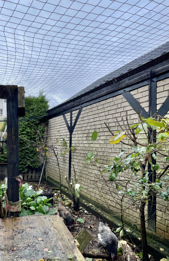 Schutz der Hühner vor "Luftangriffen" . Das Netz lässt sich gut montieren und die schwarze Ausführung ist optisch sehr diskret.