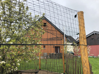 Das Anbringen und Fixieren des Netzes hat sehr gut funktioniert. Ich bin froh, dass ich hie auf Qualität gesetzt habe. Die Knoten halten gut, und das Netz hat nach einigen Monaten in Wind und Wetter keine Spannung verloren. Dazu habe ich passgenaue Stücke verwenden können, um der etwas ungewöhnlichen Form des Geheges Rechnung zu tragen.