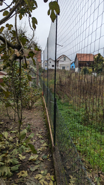 Wir bauen den Auslauf für unsere Hühner stetig aus, und es musste wieder ein Teilstück gesichert werden. Das bewährte Netz passt jetzt genau in die entstandene Lücke und verhindert die Flucht der Tiere. Wie immer perfekt - das Netz befestigen wir dieses mal mit Rundhaken.