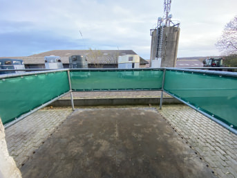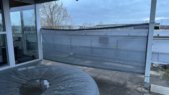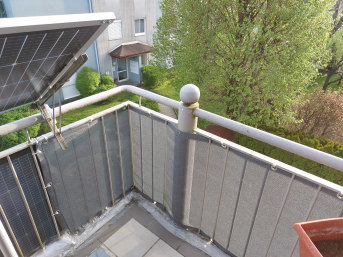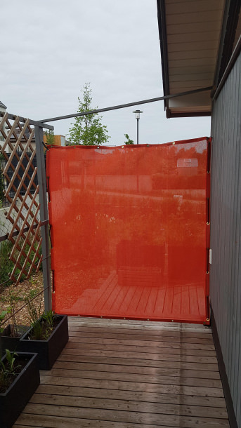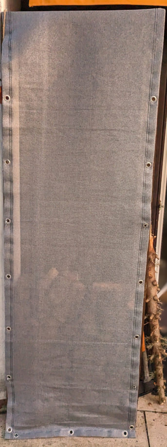 Der Wind-/Sichtschutz wurde auf Maß bestellt, um auf dem Balkon mehr Privatsphäre herzustellen und um ein Katzenproblem zu lösen. Dabei sollte das Material hell und soweit mögilch Licht- und Luftdurchlässig sein (bestellt wurde 50% Durchlässigkeit).