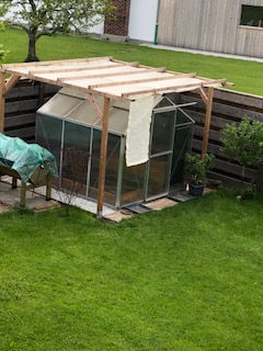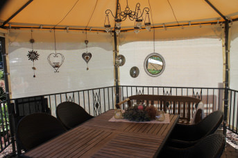 Wir hatten bisher eine hohe, breite Tujahecke an unserem Grundstück, die uns Sicht- und Windschutz geboten hatte. Im vergangenen Herbst haben wir die Hecke entfernt und suchten nach einer Ersatzlösung für Sicht- und Windschutz in unserem Pavillon.