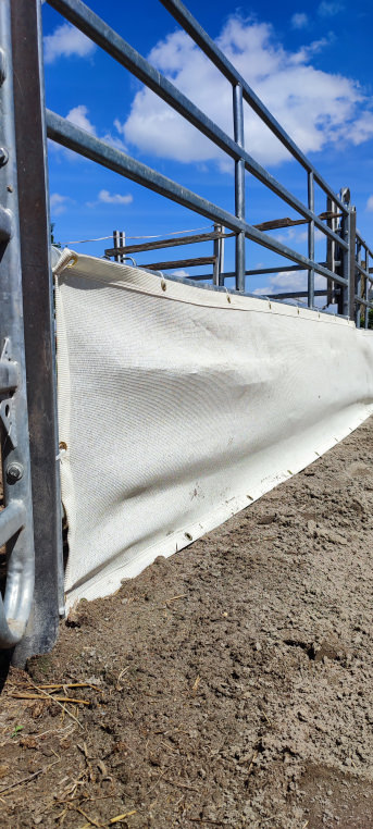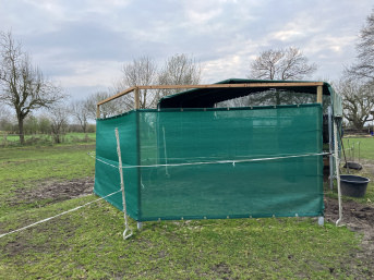 Durch die eng gewählte Verstärkung mit Ösen kann man die Netze schön spannen. Jetzt kann der Herbst kommen. Die Ponys sind beim Fressen vor Wind geschützt.