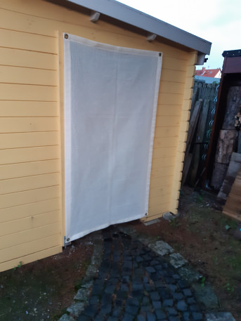 Nach reichlicher Überlegung und Suche im Internet stieß ich dann auf die maßgefertigten feinmaschigen Windschutznetze mit Ösen.