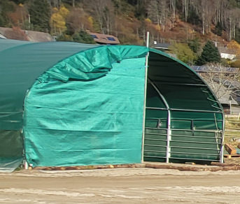 Wir haben das Beste draus gemacht für unsere Bedürfnisse, da es leider nicht möglich ist, den Radius des Zeltes genau zu ermitteln. Also haben wir das überstehende Ende oben einfach mit einem Spanngurt verzurrt. Das Netz ist tiptop und hält Regen, Wind und Schnee gut ab. Es überzeugt auch durch eine robuste Qualität. Das Stallzelt ist nun gut geschützt und trotzdem gut belüftet.