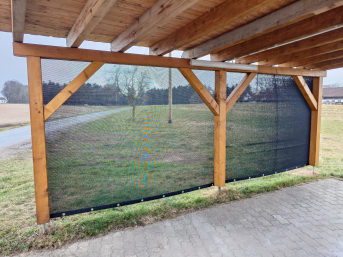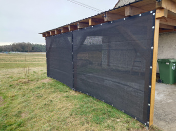 Ich habe 4 Windschutznetze nach meinen Wunschmaßen bestellt. Die Netze haben wir am Unterstand der Pferde angebracht. Dazu wurde zusätzlich ein Drahtseil durch die oberen Ösen geführt und ein Gummiseil an den drei restlichen Seiten mittels Rundknöpfen gespannt. Diese Konstruktion ermöglicht ein temporäres öffnen/aufschieben der Windschutznetze im Bedarfsfall.