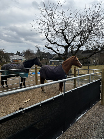 Ich habe zwei Schutznetze als Windschutz für die Paddockbox unseres Pferdes gekauft, da es in der Stallgasse sehr stark zieht. Das Ausmessen, Bestellen und Anbringen der Netze funktionierte schnell und einfach. Die Netze funktionieren sehr gut. Wenn die Boxentür geschlossen ist, zieht es nicht mehr. Außerdem sehen sie ordentlich aus, so dass auch der Stallbesitzer keine Bedenken hatte.