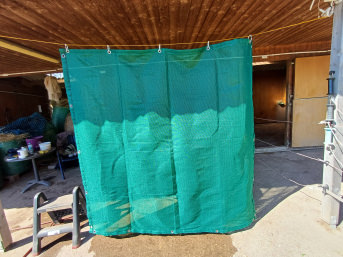 An unserem Putzplatz ist es durch die direkte Sonneneinstrahlung nachmittags unerträglich heiß. Da nicht jeder einen Sonnenschutz möchte, haben wir uns für eine 'mobile' Variante entschieden. Ganz einfach aufzuhängen an einer gespannten Wäscheleine und mit offenen Kunststoffhaken. Das Netz kühlt angenehm und immer weht ein leichtes Lüftchen hindurch. Eine super Lösung für uns!