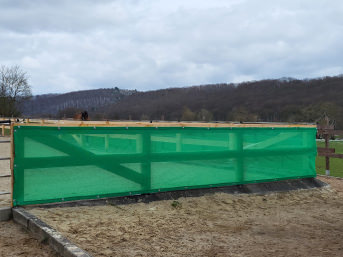 Mit den eingelassenen Ösen und seiner hohen Widerstandsfähigkeit, verkleiden Sie so auch Gebäuden wie Ställe, Offenställe und Reithallen. Das sorgt nicht nur für ein gutes, natürliches Klima, sondern spart auch Kosten: Die Halle brauchen Sie nur während dunkler Monate und in den Abendstunden zu beleuchten. Der Schattierwert von 50 % lässt das Tageslicht einfallen und sorgt somit nicht nur für gute Luft- sondern auch Lichtverhältnisse. Den Rest des Tages profitieren Pferd und Reiter vom natürlichen Licht in der Reithalle.