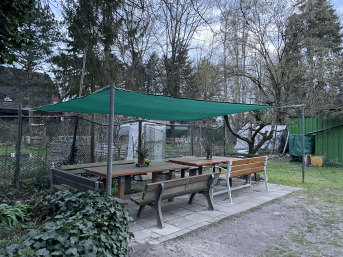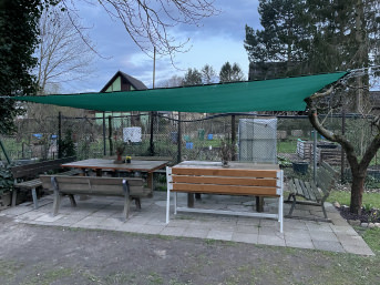 Wir sind ehrenamtlich im Volkspark Lichtenrade tätig und wenn wir mit der Arbeit fertig sind, wollten wir nicht in der prallen Sonne sitzen. Bisher sind wir mit dem Ergebnis voll zufrieden. Die Bewährungsprobe steht aber noch an, > wenn Wind aufkommt. Laut Anfrage, sollte das Netz nur bei starkem Sturm abgebaut werden. Wir hoffen , das Netz wie ein Faltdach auf den Stahlseilen zusammenschieben zu können. Mal sehen.