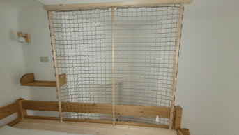 Wir haben das Edelstahl- Befestigungssystem in zwei verschieden Längen bestellt. Einmal in 40cm die in 2x20cm und einmal in 60cm die in 2x30cm geliefert wurden. Unsere Systeme wurde mit den dazugehörigen Holzharken an der Deckenleiste befestigt. Die Harken sind schnell reingedreht und das Netz auf den Stangen aufgefädelt. Bei uns dient das Edelstahl- Befestigungssystem dazu, das Netz oben an der Decke zu befestigen.